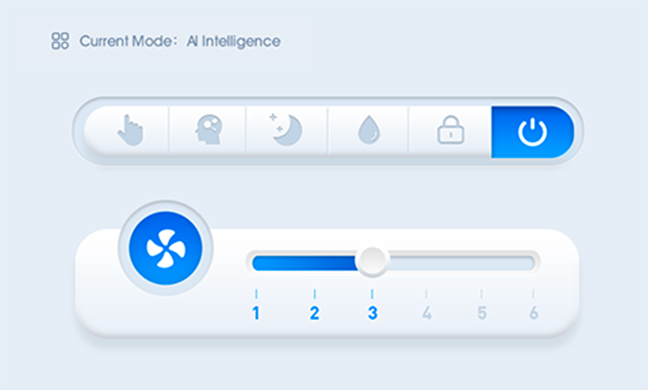 Control interface includes manual mode,A.I Mode (particles purification & humidification) and sleep Mode. Under A.I. Mode,max fan speed is gear 5.if you want to turn to gear 6,please quit A.I. Mode and enter manual mode.