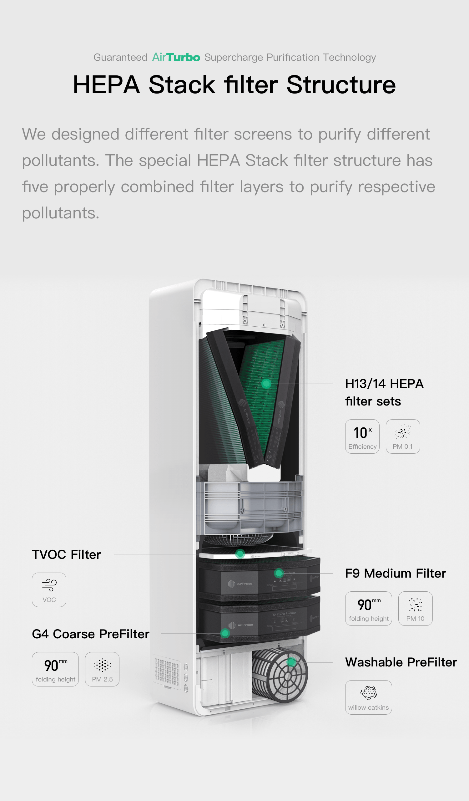 Supercharge purification technology creates a positive pressure indoor environment. No need to lay complex pipelines. Clean air is at your hand. Brings in new air, purifies air source at 5 times the efficiency of regular purifier, and solves the problem of excessive indoor CO2.