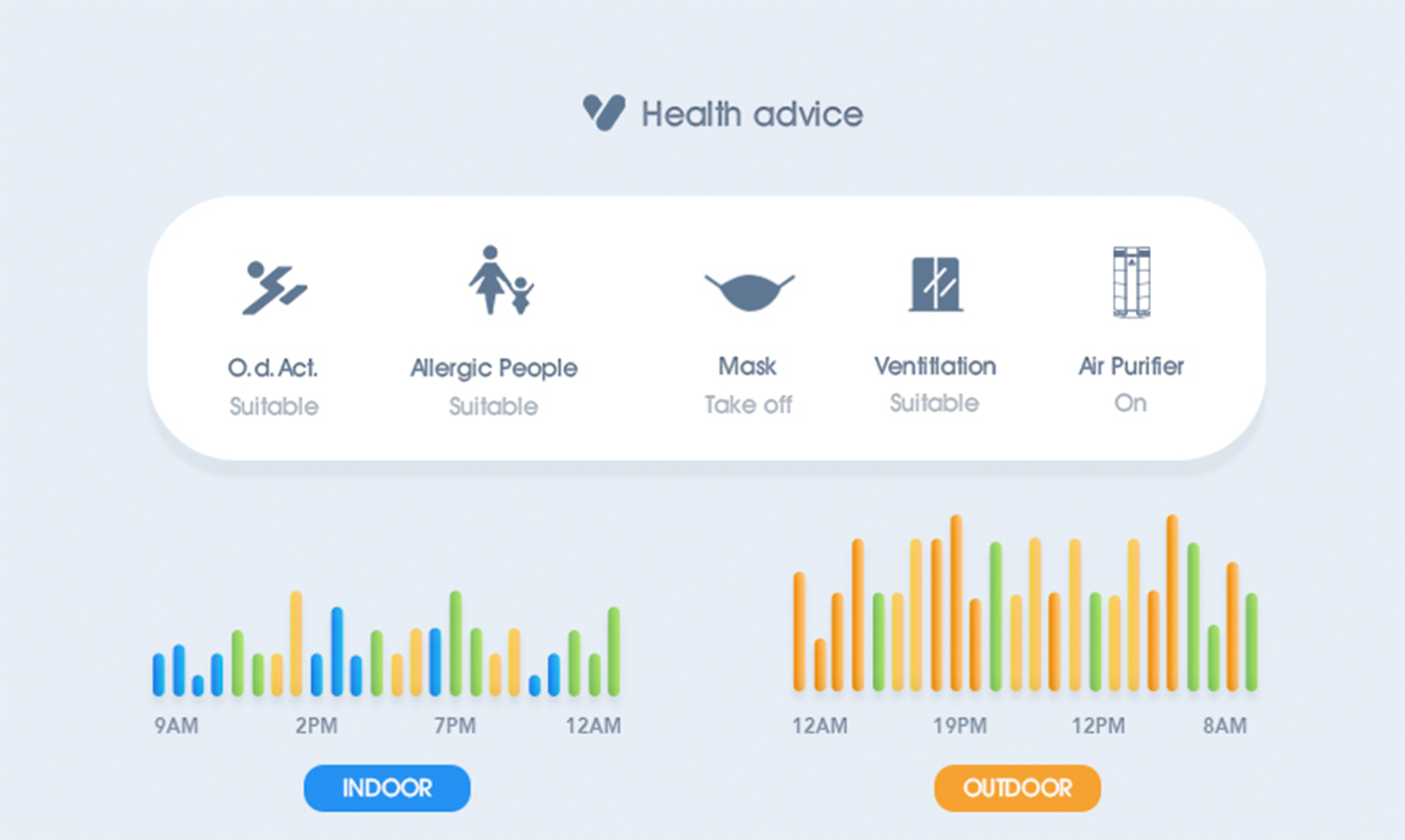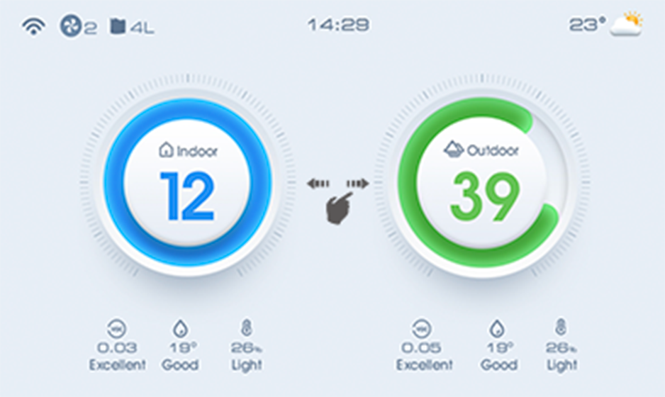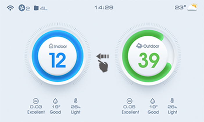 2.Slide the homepage to the left ,showing health advice, 24-hour indoor and outdoor PM2.5 data.