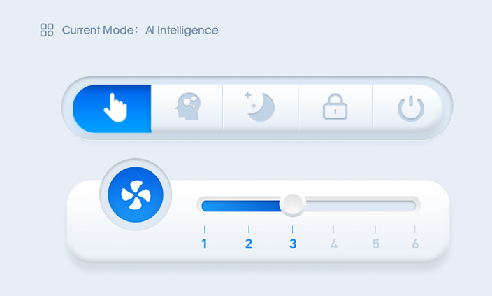 Control interface includes manual mode,A.I Mode and sleep mode.Under A.I. mode ,max fan speed is gear 5.If you want to turn to gear 6,please quit A.I. mode and enter manual mode.