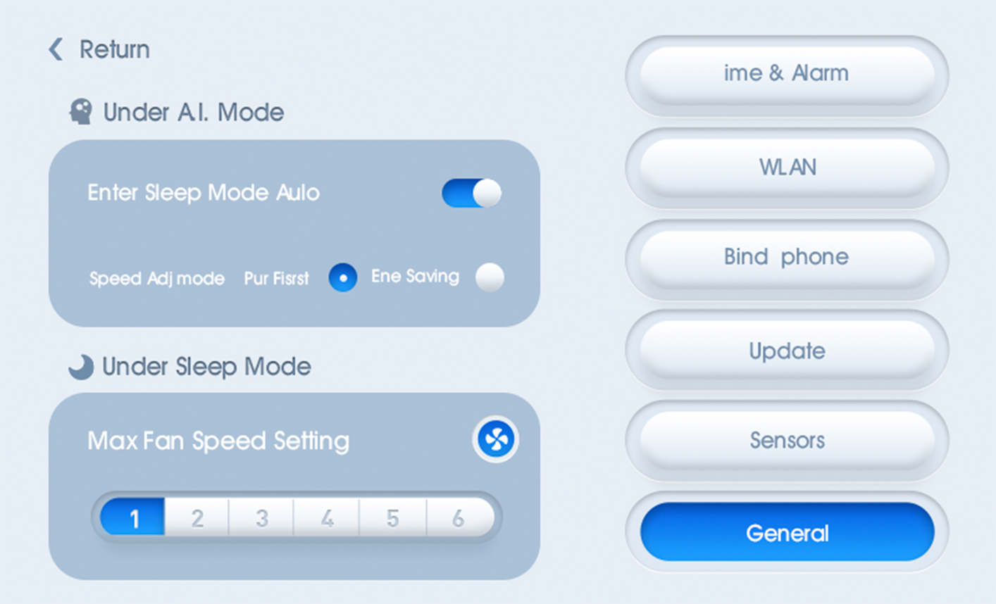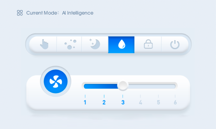 Control interface includes manual mode,A.I Mode (particles purification & humidification) and sleep Mode. Under A.I. Mode,max fan speed is gear 5.if you want to turn to gear 6,please quit A.I. Mode and enter manual mode.