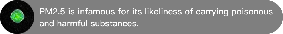 The danger of fine particles is inversely proportional to their sizes. PM0.1 can enter alveoli, blood, and nervous system. Research has found its correlation with leukemia and cardiovascular diseases. Among these matters are metallic elements (e.g. manganese, lead, titanium, vanadium), radon, bacteria and virus (e.g. influenza virus, SARS virus, and H1N1 virus).