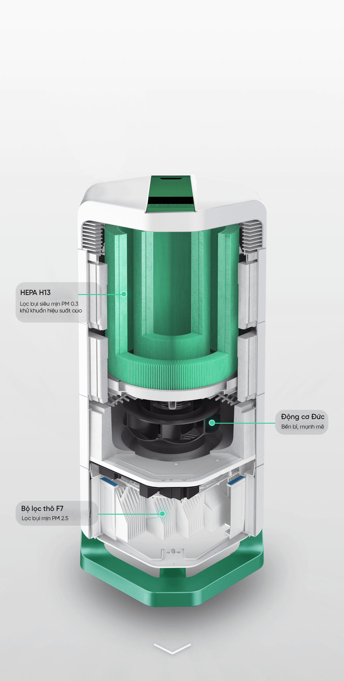 Động cơ quạt cao cấp nhập khẩu từ Đức, tích hợp công nghệ chống ô nhiễm thứ cấp