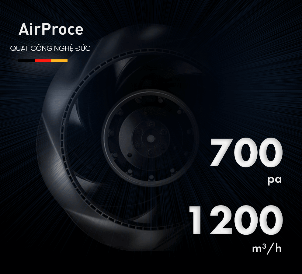 Động cơ quạt nhập khẩu từ hãng EBM Papst - Đức được ví như "trái tim" vận hành mạnh mẽ của các dòng máy AirProce. Với lưu lượng gió lớn lên tới 1200m3/h, thiết bị đảm bảo khả năng tuần hoàn không khí liên tục và nhanh chóng