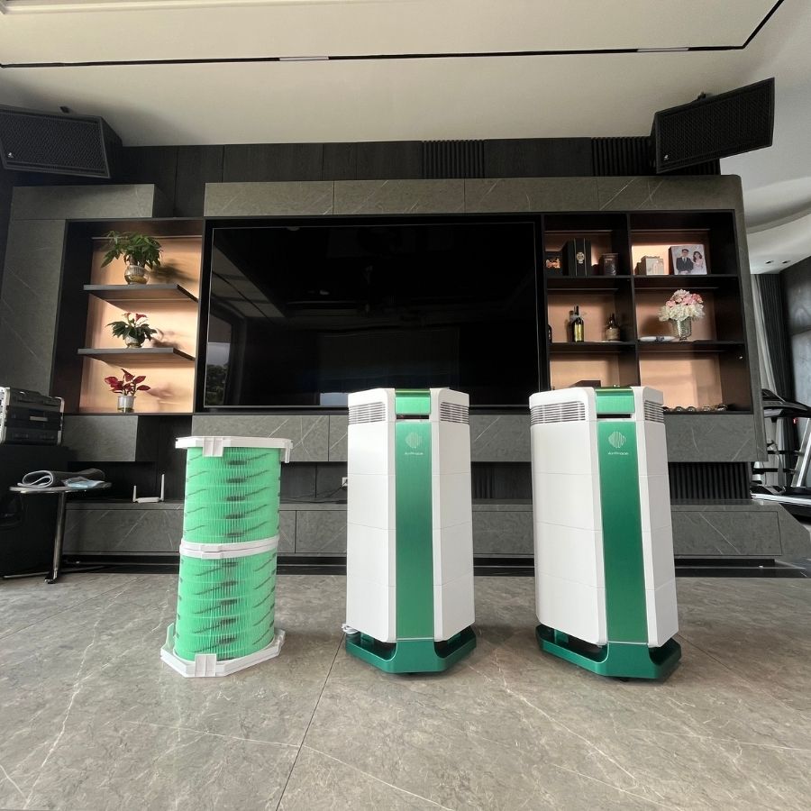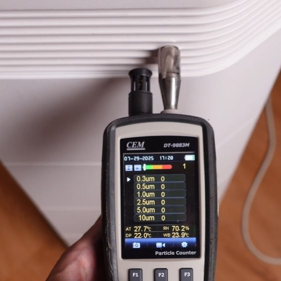 Để đánh giá hiệu quả lọc bụi mịn của máy lọc không khí AI-730, nhóm chuyên gia kỹ thuật đã tiến hành thử nghiệm trong phòng kín diện tích 60m². Máy được vận hành ở điều kiện tiêu chuẩn và đo nồng độ bụi tại cửa gió đầu ra bằng thiết bị đo bụi CEM chuyên dụng.